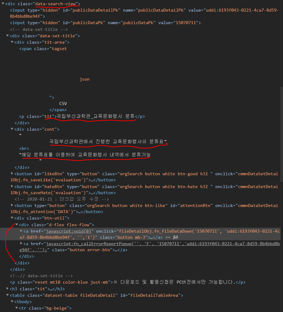 먼저 제목, 데이터 내용, 다운로드 버튼의 정보를 추출하기 위해서 Dev tools로 확인해본 결과
