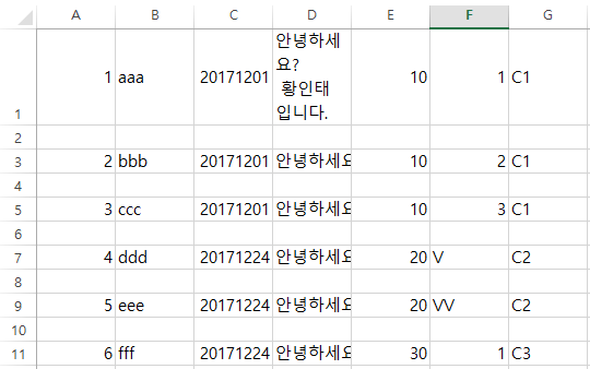 ["1", "aaa", "20171201", "안녕하세요? \n 황인태 입니다.", "10", "1", "C1"],