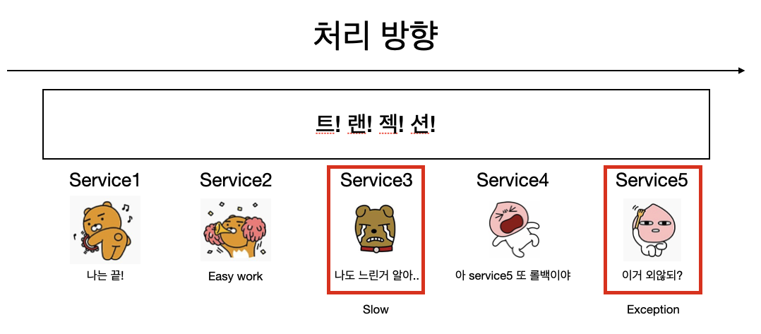 그렇기 때문에 예상되는 문제가 발생할 수 있는데요. 여러개의 service가 한 트랜젝션에서 호출되었을 때 가장 큰 문제점은 다음과 같습니다.