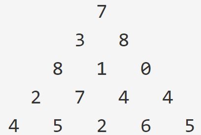 문제 7 3 8 8 1 0 2 7 4 4 4 5 2 6 5 위 그림은 크기가 5인 정수 삼각형의 한 모습이다. 맨 위층 7부터 시작해서 아래에 있는 수 중 하나를 선택하여 아래층으로 내려올 때, 이제까지 선택된 수의 합이 최대가 되는 경로를 구하는 프로그램을 작성하라. 아래층에 있는 수는 현재 층에서 선택된 수의 대각선 왼쪽 또는 대각선 오른쪽에 있는 것 중에서만 선택할 수 있다. 삼각형의 크기는 1 이상 500 이하이다. 삼각형을 이루고 있는 각 수는